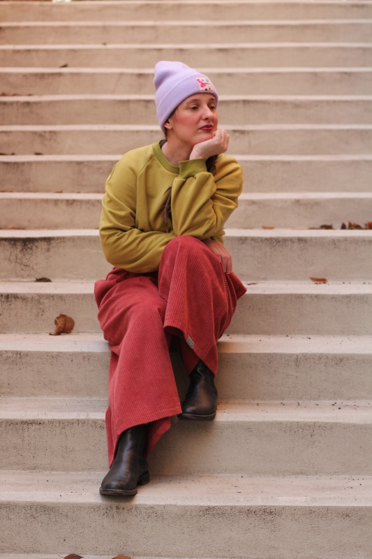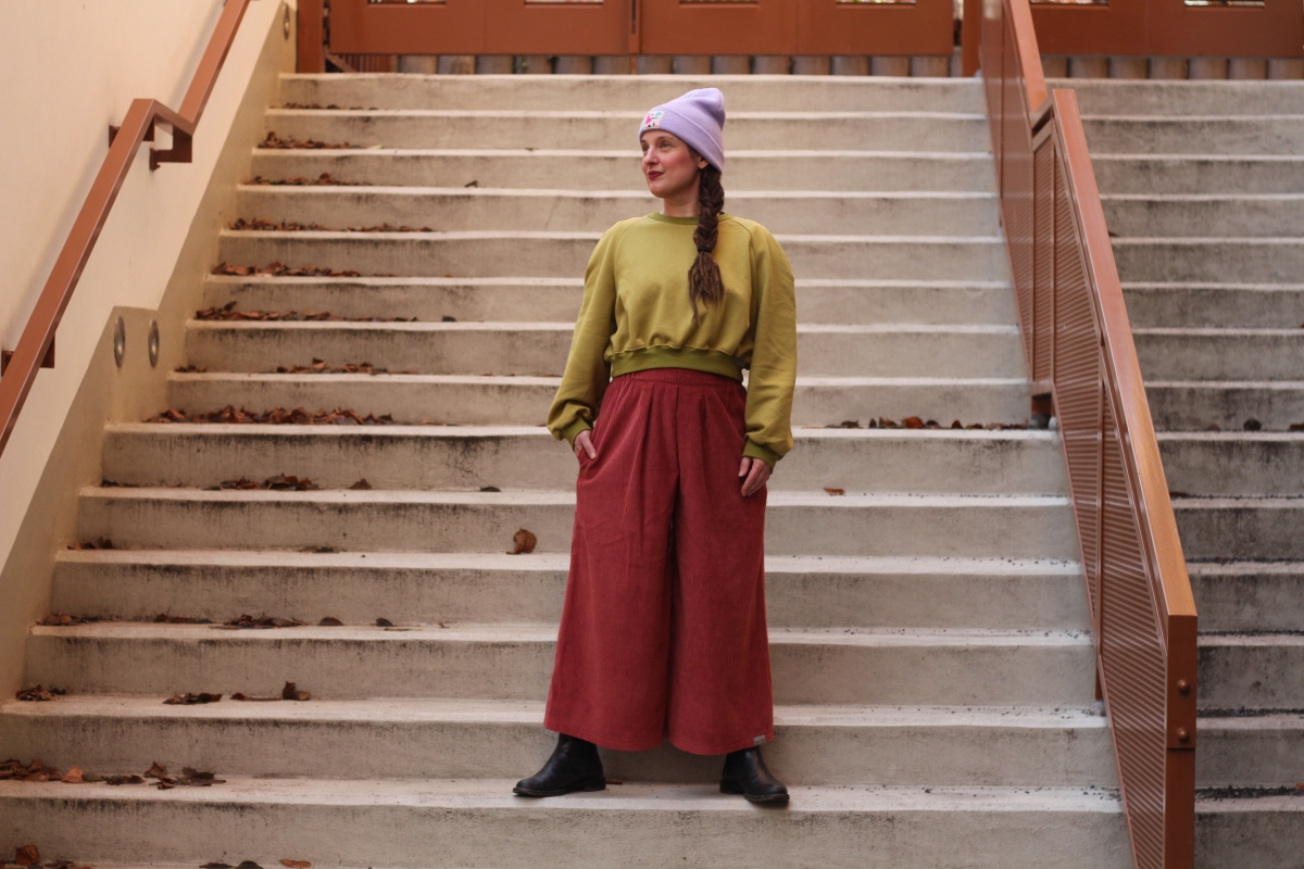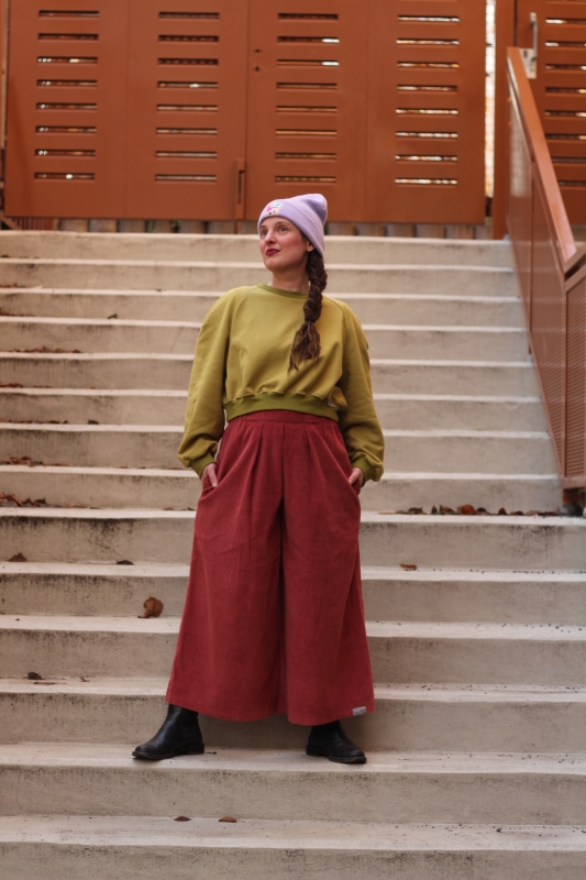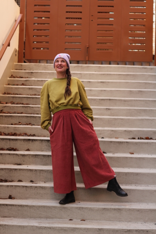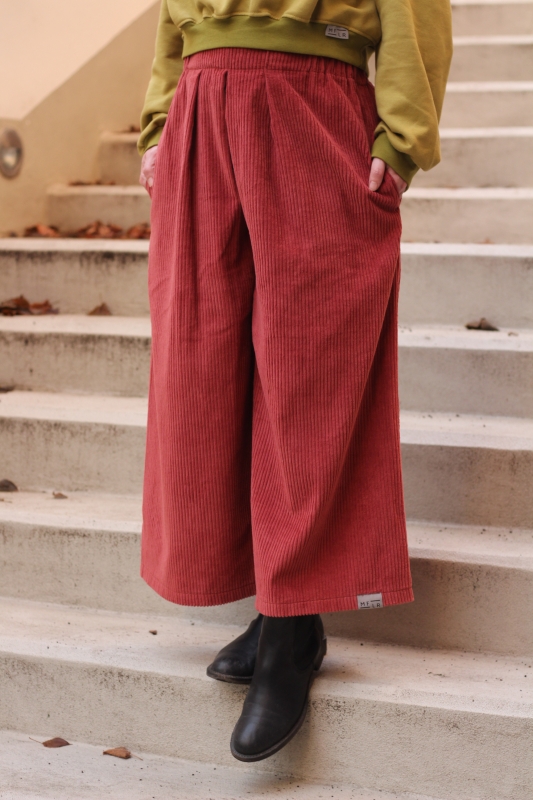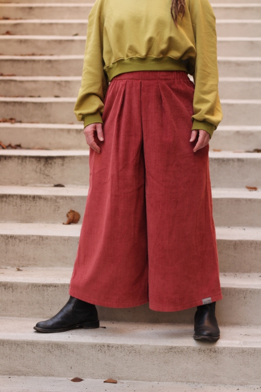 Kalhoty jsou ušité z bavlněného manšestru, mají široké nohavice a jsou velmi pohodlné, dokonce tak pohodlné, že už je nebudete chtít sundat a nebudete chtít nosit jiné.