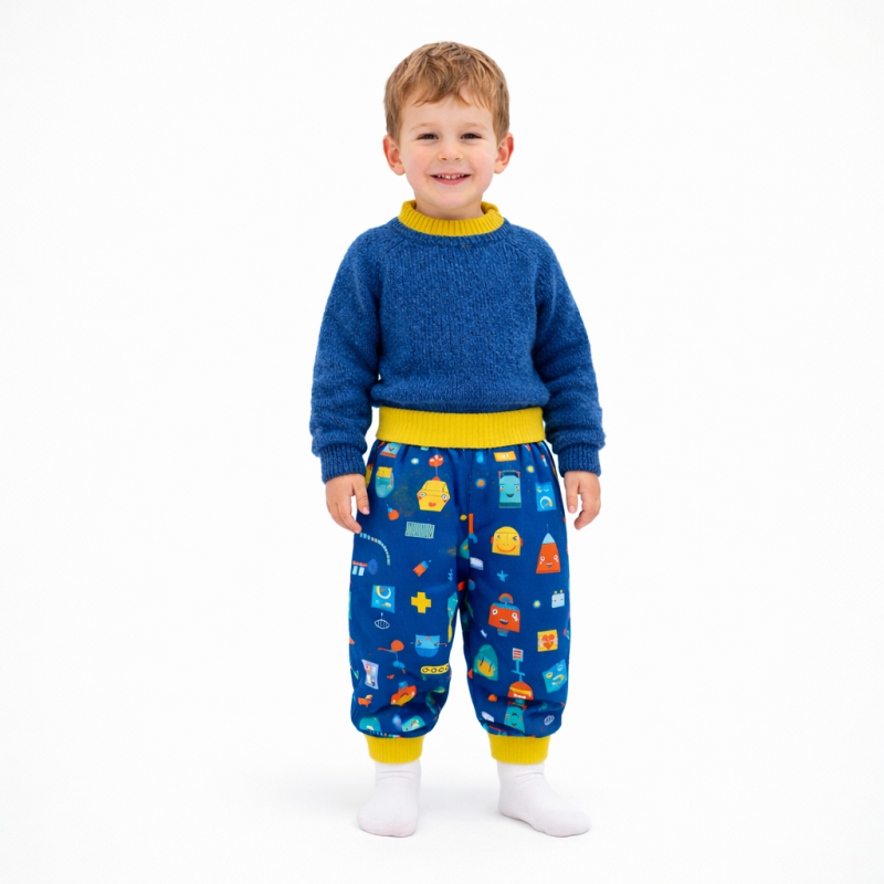 Tepláčky jsou ušité z funkčního nepromokavého materiálu, jehož vnitřní stranu tvoří měkoučkým fleese... Díky nápletům v pase i u nohavic rostou s dětmi:) Mají snížený sed, aby se pohodlně vešla i plínka. Vysoký pas je také velice praktický, zakryje zádíčka, když dítě sedí na bobečku. Díky nápletům vydrží více sezón. Spodní lemy jsou ušité z tenkého softshellu a jsou také nepromokavé.