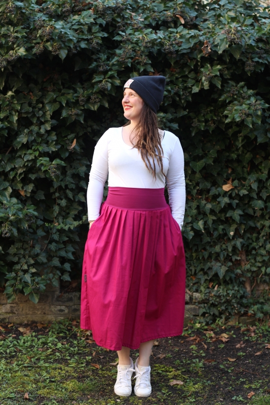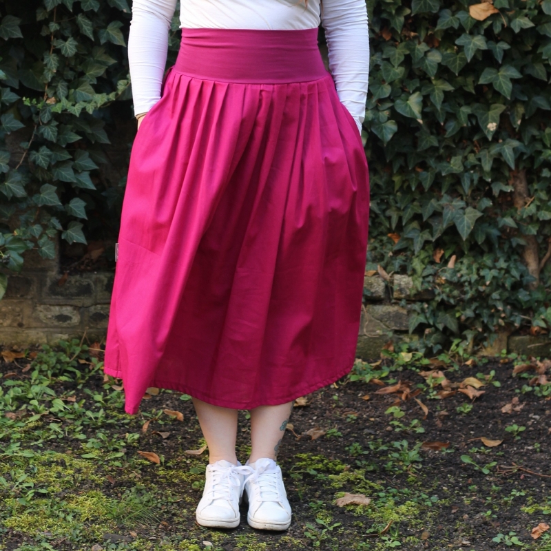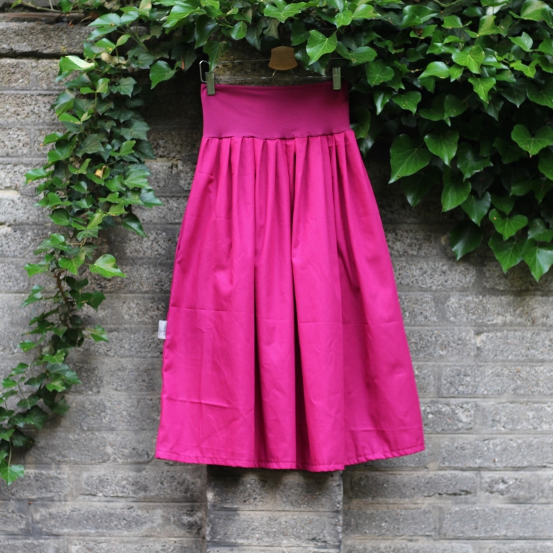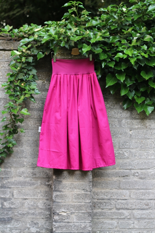 Sukýnka je ušita z kvalitního designového bavlněného plátýnka a je bohatě řasená. Nahoře má dvojitý pružný bavlněný pás, který lze dle potřeby ohrnout, a který je velice příjemný a hodně pružný.